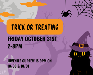 The Borough of Riverton has instituted a curfew for October 30 and October 31 from 9pm – 5am for people under the age of 18. They may not be outside without a guardian. Also the hours for Trick or Treating on October 31 will be from 2-8pm. We’re asking all drivers to please be extra careful as little ones will be crossing streets. Be safe and have fun everyone!!